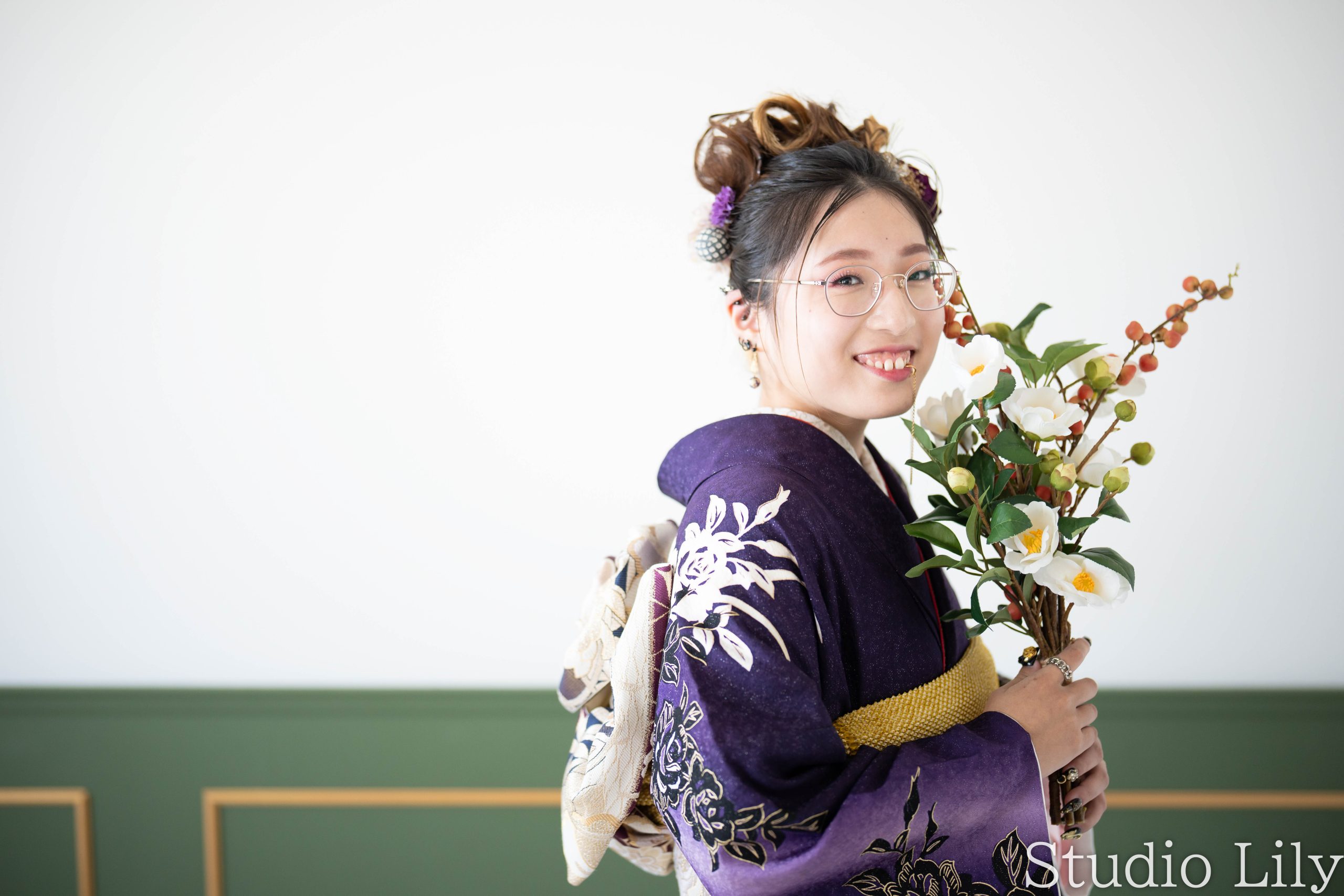 こんにちは!姫路の写真スタジオ、スタジオリリーです。 今回ご紹介させて頂くのは、振袖スタジオ撮影でご来店下さったお嬢様。 お召しになったのは、モノクロに金の淵で描かれた華が美しい紫のお振袖。統一感のあるシックな帯を合わせ […]